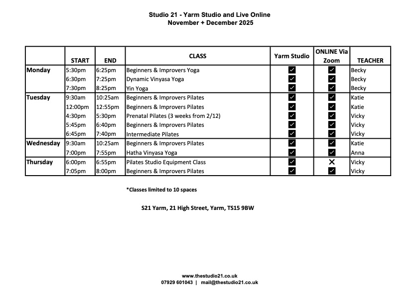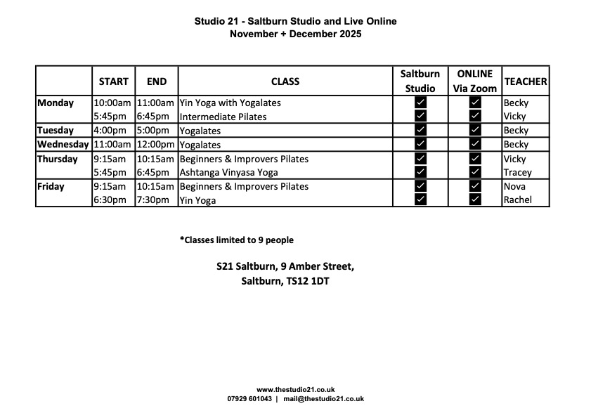 Pilates and Yoga Classes in Yarm and Saltburn by the Sea.